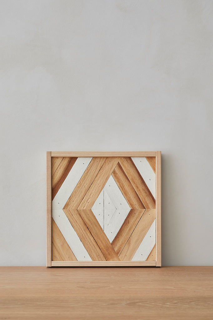Rich with striking contrast, this Geometric Wood Piece captures the essence of the raw, stark beauty of the high desert. Meticulously crafted, this work of art plays with neutral tones and minimalistic forms to create a sense of refined contemporary design. Add this piece to your space and experience the way it seamlessly blends sophistication with the simplicity found in nature.
