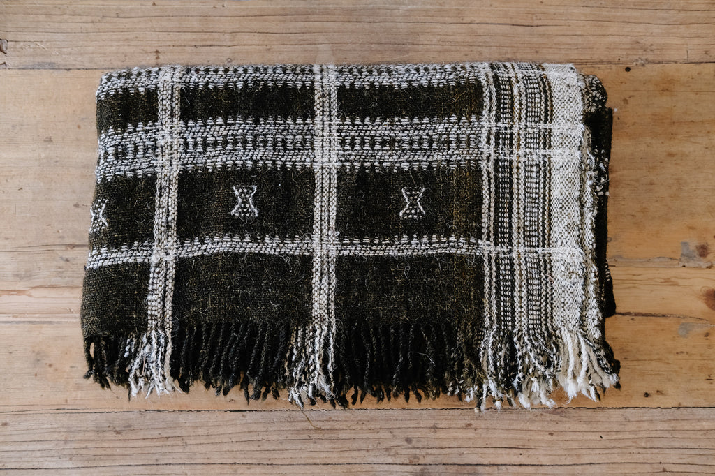 These textiles are handcrafted by the local artisans of Bhujodi, a traditional weaver's village in India. They are woven with old-world, wooden handlooms using techniques passed down by generations. Bhujodi throws are made of 100% hand-spun wool and natural dyes. Please note that because of the natural dying process and the nature of handwoven textiles, color and motif can vary slightly from piece to piece.