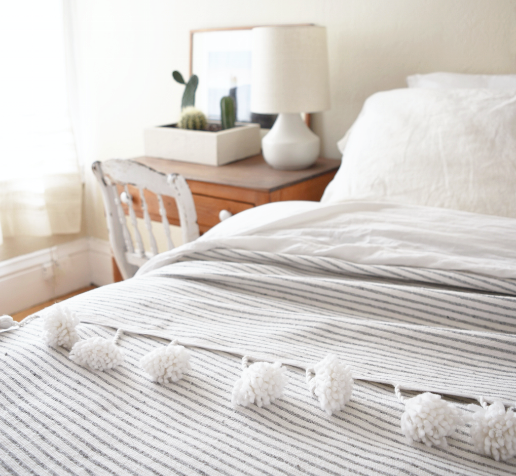 This gorgeous Moroccan Pom Bed Throw is a traditional Moroccan textile that lends perfectly to a sophisticated bohemian style. It features classic light grey and white stripes with oh-so-fun oversized pom tassels that line two sides of the throw. They are the ideal size to be used as a coverlet for a Full/Queen bed as shown, but also look beautiful spread at the base of a King bed with tassels on the sides, or used as a throw on your sofa!