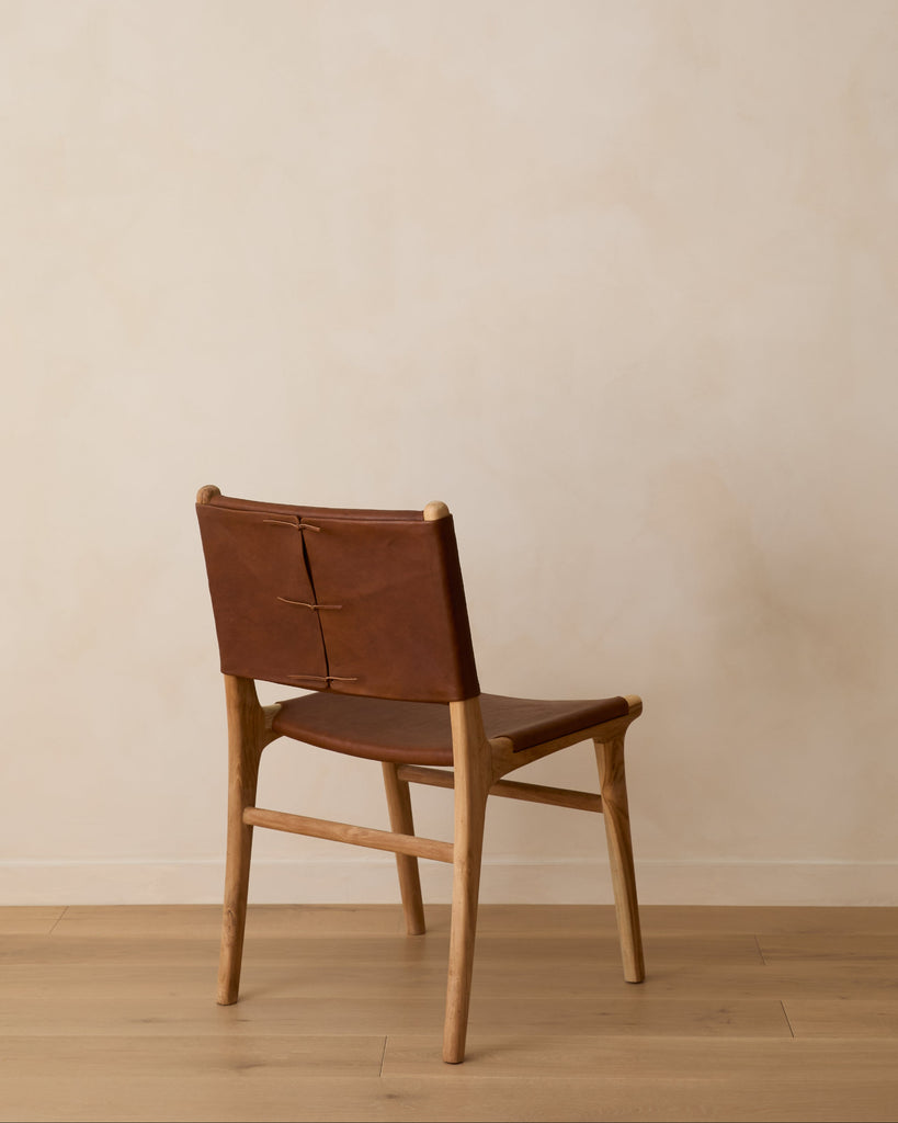 These chairs are expertly handcrafted by our artisan partners in Bali with Javanese teak wood and leather. There is variation between natural materials and leather, making each piece unique and one of a kind. The supple semi vegetable-tanned leather has a softly worn waxed finish that deepens into a distinctive patina. Please note that because of the natural dying process, the leather color can vary slightly from batch to batch. Variations in texture and tone are all inherent to the leather hide and the dying process.
