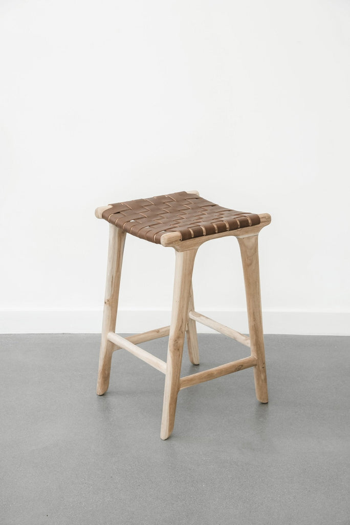 Handsome and built for the rigors of daily use, these leather strap woven counter stools are the embodiment of form meets function. Timeless and versatile, they add warmth and comfort to any kitchen! This counter stool features woven leather straps in our warm saddle colorway on a carved teak frame in our signature natural matte finish. These stools are expertly handcrafted in Bali with Javanese teak wood and leather.