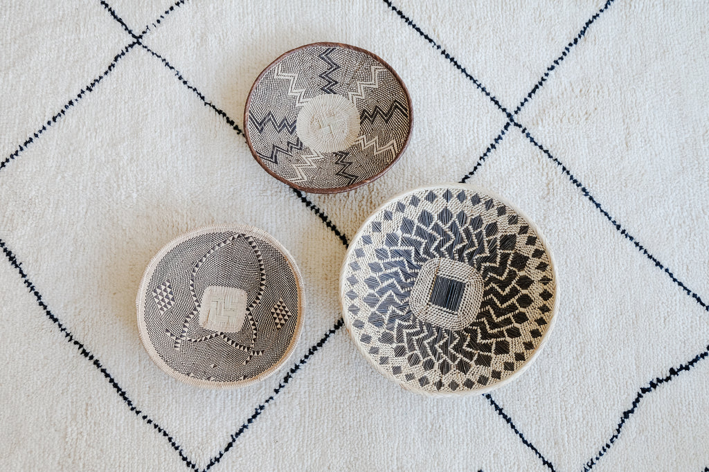These woven ilala palm baskets add a textural and artistic element to your space. They feature intricate traditional patterns in a neutral color palette making them a bold yet versatile statement accent. They look beautiful clustered together on a wall above a bed or sofa, or perched on a shelf or mantelpiece. This one-of-a-kind set of 3 features two baskets with a rich brown edging and one basket with cream edging.