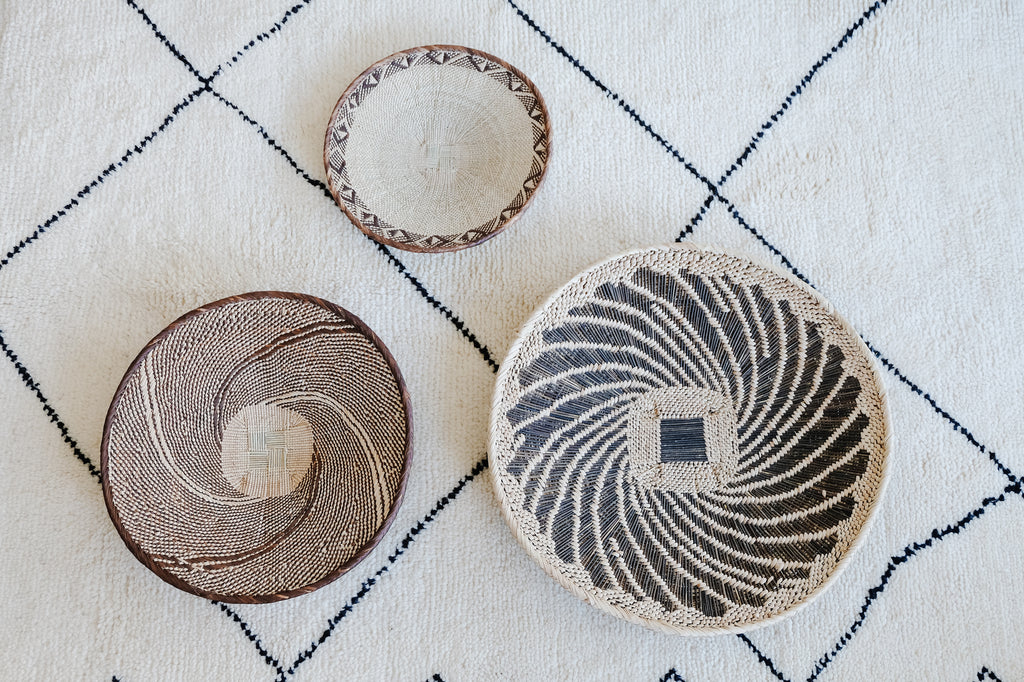 These woven ilala palm baskets add a textural and artistic element to your space. They feature intricate traditional patterns in a neutral color palette making them a bold yet versatile statement accent. They look beautiful clustered together on a wall above a bed or sofa, or perched on a shelf or mantelpiece. This one-of-a-kind set of 3 features two baskets with a rich brown edging and one basket with cream edging.