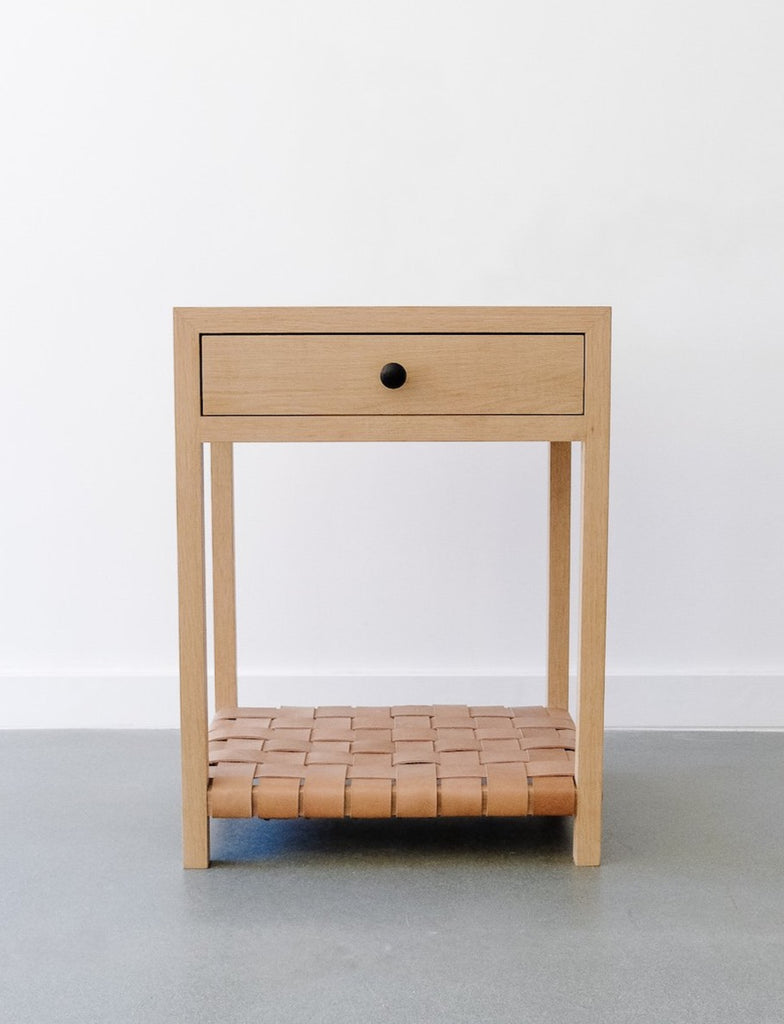 Crisp lines, an airy open frame, and the organic softness of leather accents. Made with luxurious natural materials, this white oak side table adds sophistication and a natural warmth to your bedroom or living space. Designed for form and function, it features a practical soft close drawer to tuck things out of sight and an open storage shelf made with our signature leather strapping. Its frame of white oak has a soft matte finish to showcase the wood’s natural color and grain. Drawer pulls feature a hammered matte black finish. Inspired by the natural beauty of our coastal home and designed for everyday luxury, this side table is the epitome of our California casual style.
