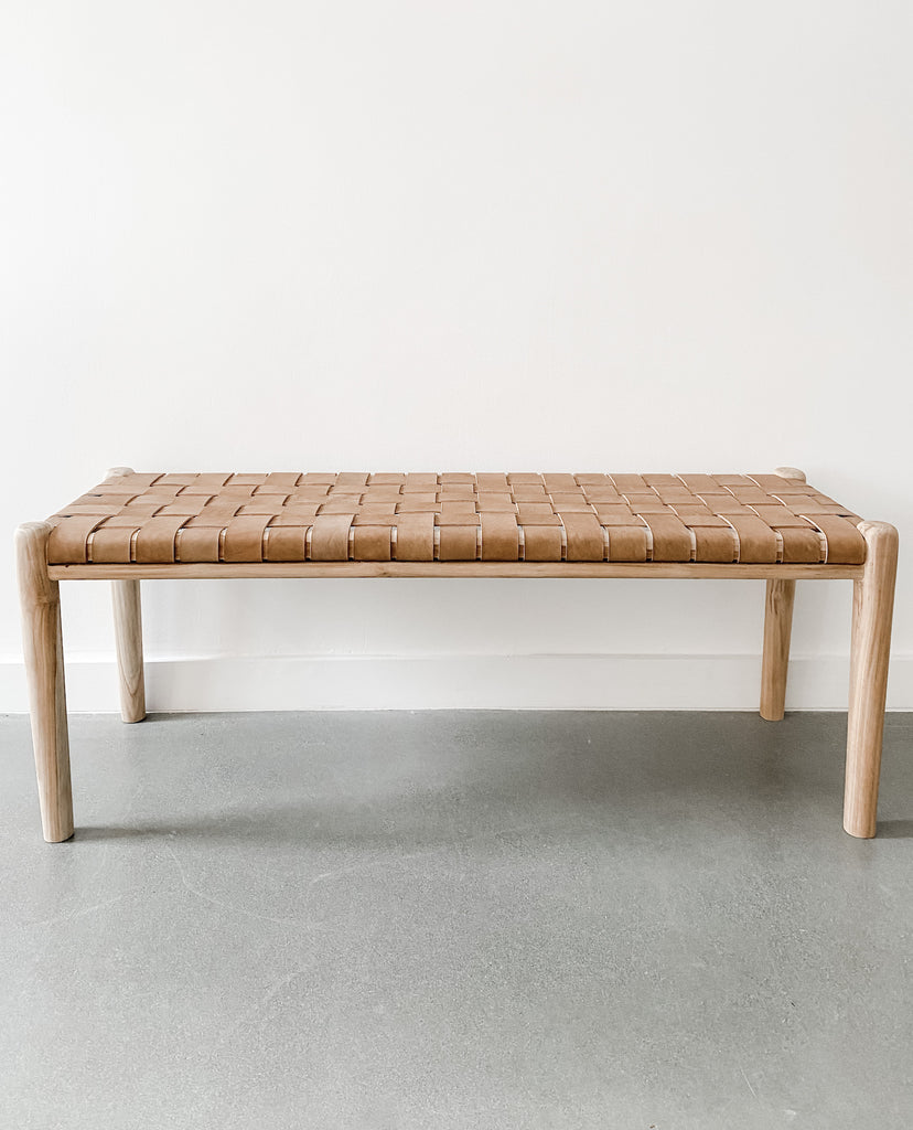 This effortlessly elegant woven leather bench is as versatile as they come. It makes the perfect landing spot in your foyer or at the foot of your bed, and can even conveniently be used as additional dining room seating while entertaining. This bench has a teak frame featuring turned legs in a nod to mid-century aesthetic and a seat of woven leather straps in our versatile beige colorway. However it’s used, it’s sure to give your space added comfort and style. These benches are expertly handcrafted in Bali with Javanese teak wood and leather.