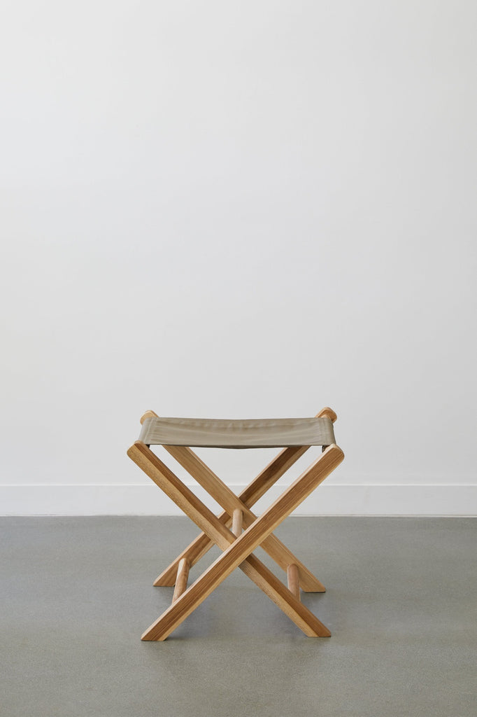 This traveled and contemporary take on a director's stool is a minimalist's dream. Use as an accent piece to complete any room or pair it with our Director's Chair to make a full set. Our Canvas Folding Stool is also perfect for adding additional seating for indoor or outdoor dining. Small and easy to store, just fold them up to tuck away until they are needed next! The Canvas Folding Stool features a hand-carved teak frame in a natural matte finish, and a hammock style seat in a beautiful taupe canvas fabric.