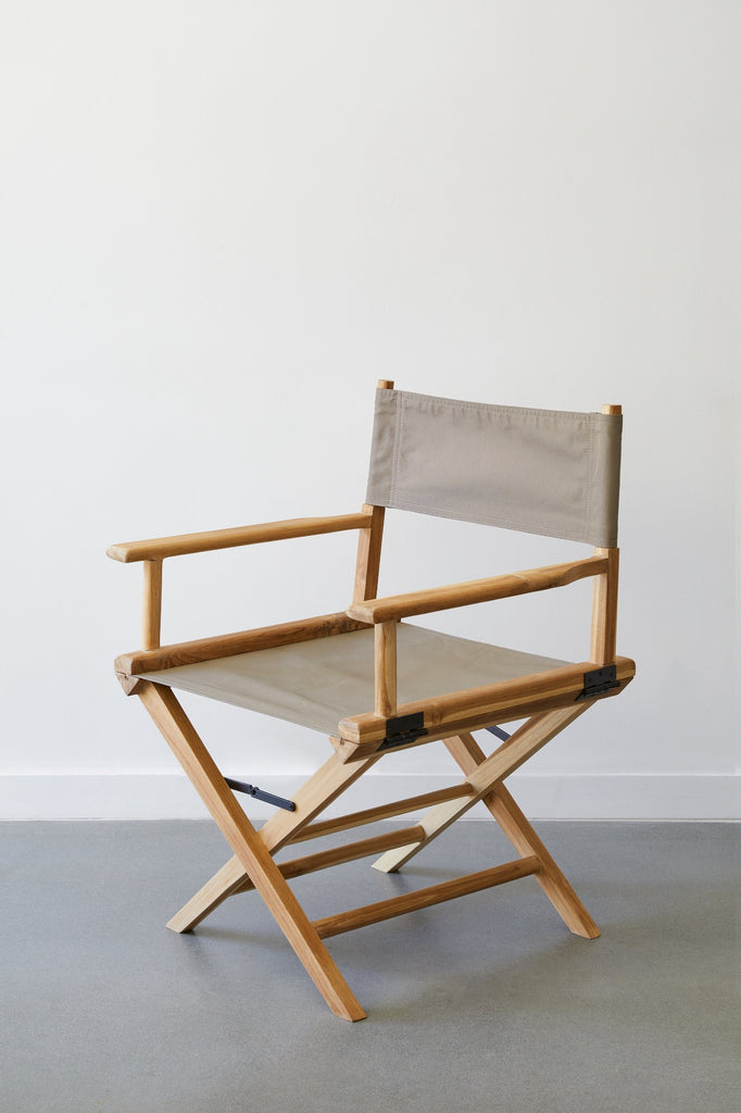 This timeless folding chair is built for the modern-day director, with graceful touches and soft details. Featuring our signature teak frame hand-built in Bali, with a beautiful oatmeal canvas fabric and black powder-coated hinges, our Director’s Chair is suitable for both indoor and outdoor use. Built for making big moves on set, or for kicking back and relaxing outdoors, we’ve designed a wider seat and arm rests for maximum comfort. This practical folding chair really can do it all - and so can you!