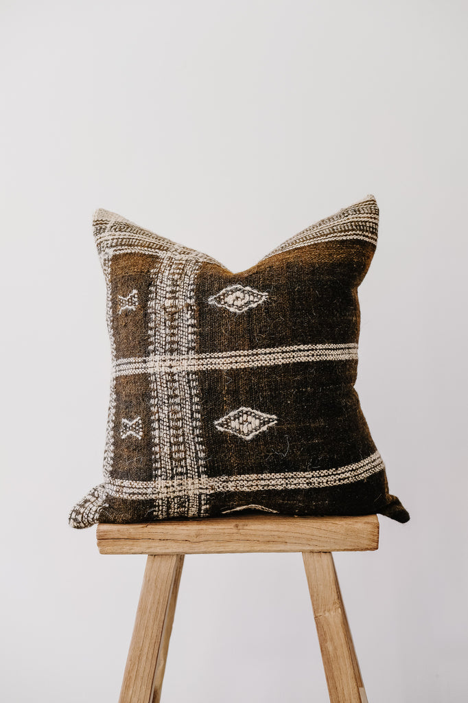 Side view of No. 35 - Handwoven Bhujodi Pillow - Dark Brown on an Antique Stool against a white wall. - Saffron and Poe