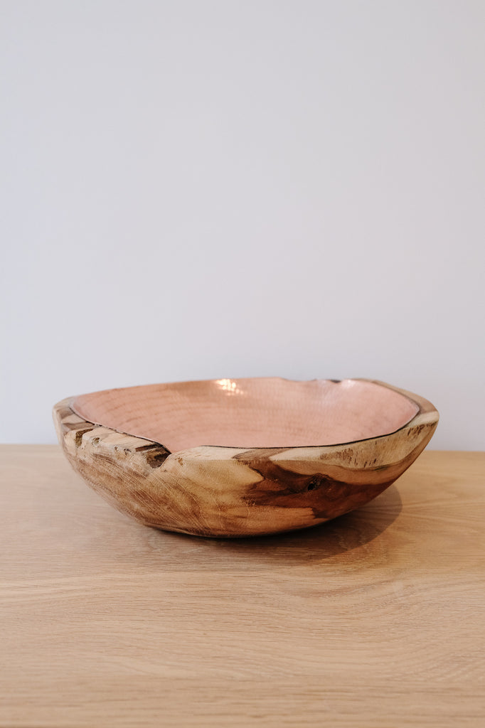 Elevated and organic, these copper and teak root bowls make a natural yet luxurious accent to any space. We love to show them off styled on a console, table, or collected shelf. Accessory meets art when paired with our wood Bali Beads draped in the bowl or used as a decorative landing spot for collected treasures. But feel free to put these lovely bowls to work as a catch-all by an entryway or by your bedside. Featuring hand carved teak root in a natural matte finish lined with a hammered copper interior finish.