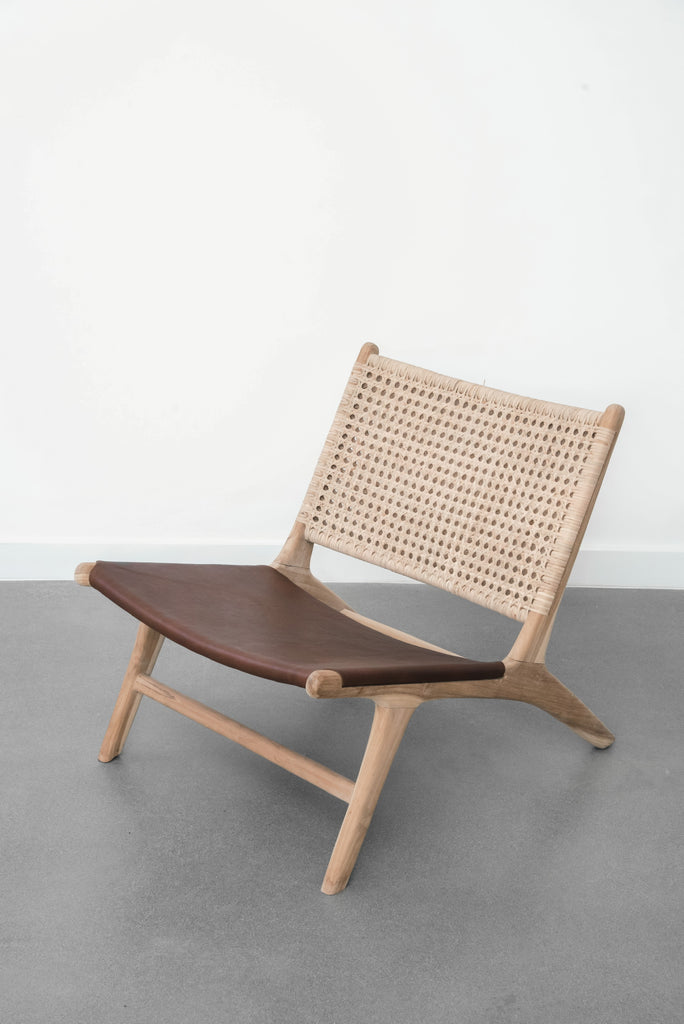 Traveled and contemporary, this versatile lounge chair combines mid-century inspired rattan and supple leather for a charming, grounding addition to any room. Featuring a stretched leather seat in our warm saddle colorway and a timeless woven Indonesian rattan back on a carved teak frame in our signature natural matte finish. These leather and rattan lounge chairs are expertly handcrafted in Bali with Javanese teak wood, rattan, and leather.