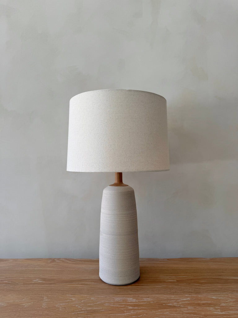 Each piece is thoughtfully crafted by hand — the base is wheel-thrown ceramic with a refined ribbed texture, paired with a hand-turned wood neck, and topped with an oatmeal linen shade. A twisted fabric cord, antique brass fittings, and a built-in dimmer switch add thoughtful details and function to this heirloom-quality piece.