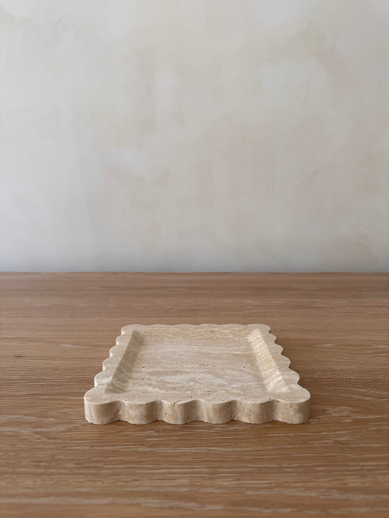 The Scalloped Travertine Tray is a study in refined simplicity. Hand-carved from natural travertine, its soft, undulating edges lend a sculptural quality that balances modern minimalism with timeless elegance. Perfectly sized for a console, coffee table, or vanity, it serves beautifully as a catch-all for keys and jewelry, or as a base for candles and decorative objects.