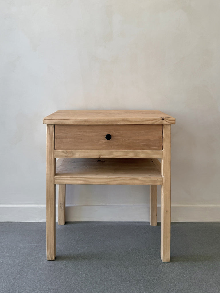 Handcrafted from reclaimed vintage cypress wood, this bedside table blends quiet simplicity with timeless character. Designed in-house and made by skilled artisans in the Shandong province of China, it features a single drawer with a hand-hammered, oil-rubbed bronze knob and an open lower shelf—perfect for storing personal items, books, or nighttime essentials. Its warm tone and subtle imperfections speak to the history of the wood, giving each piece a distinct, one-of-a-kind feel. Whether styled beside the bed or as a small accent table, it’s a functional and soulful addition to any room.