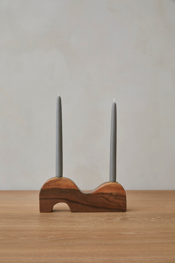 The Wave Candlestick Holder invites you to create a welcoming ambiance through gentle illumination and streamlined contemporary design. Black walnut wood ebbs and flows with organic grace, creating a candlestick holder that serves as both a source of warm lighting and as a piece of modern, sculptural art. Handcrafted and hand-finished, this candlestick holder can be added to your dining room table to elevate your tabletop decor, or placed in your living room for added soft glow. The natural swirls and patterns in the wood used to construct these pieces ensure that each candlestick holder will have its own unique character.