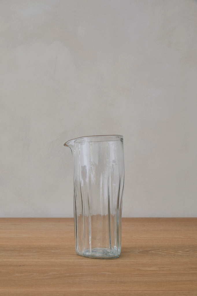 Add a touch of artisanal beauty to your tableware with this Handblown Glass Pitcher. Expertly crafted from recycled glass in Oaxaca, Mexico, this pitcher is made using traditional hand-blown glass techniques, and is designed to be used for any beverage from water to margaritas and more. When not in use for beverages, this pitcher is elegant enough to be displayed on your table filled with fresh-cut flowers, adding a touch of natural beauty to your decor. With its unique texture and classic shape, this pitcher infuses your home with elements of both beauty and sustainability.