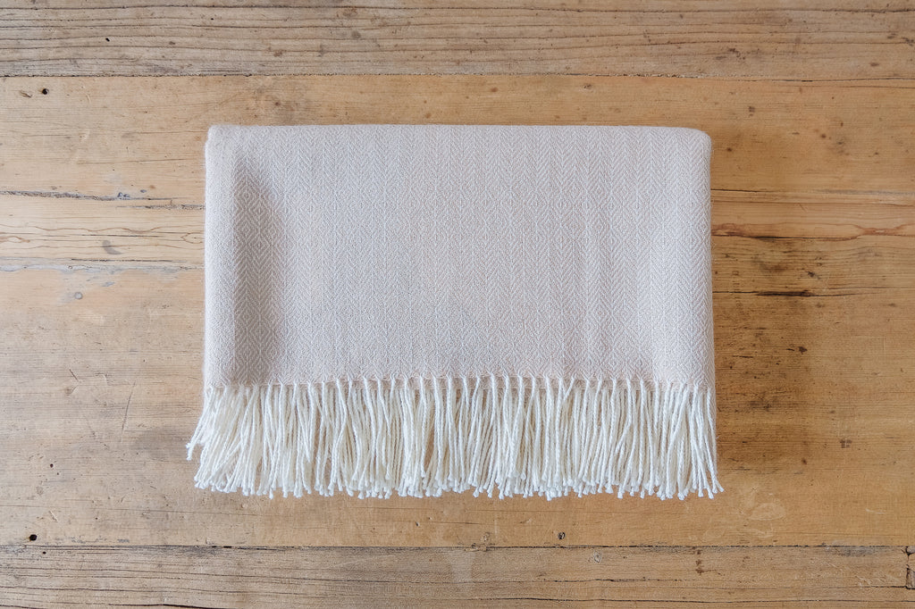 This soft and luxurious alpaca throw blanket adds warmth and comfort to your living space - and your shoulders when worn as a shawl! It’s the perfect cozy piece for the end of the bed or draped on a sofa or lounge chair. Our Beige Alpaca Throw features a sophisticated and subtle geometric motif in an intricate diamond and square pattern with long twisted fringe on each end. This throw was made for snuggling up so wrap it around you and enjoy the cozy vibes.