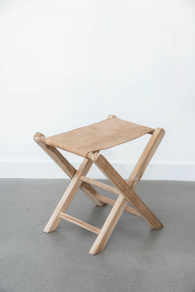 This traveled and contemporary take on a director's stool is a minimalist's dream. Use as an effortless accent piece to complete any room or have a set paired at the foot of the bed. Our Leather folding stool is also perfect for adding additional seating. Small and easy to store, just fold them up to tuck away until they are needed next! It features a folding carved teak frame in a natural matte finish and a swooping seat of leather in our beige colorway. These teak folding stools are expertly handcrafted in Bali with Javanese teak wood and leather.