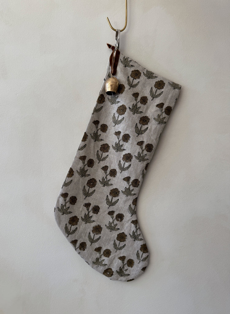 Our Indian Block Print Christmas Stockings bring artisanal beauty to your holiday traditions. Each stocking is block printed by hand on 100% linen, showcasing the timeless craft of Indian textile printing. Double lined for durability and heirloom quality, it’s finished with a vintage brass bell tied on with a cinnamon velvet ribbon — an elegant, soulful detail that makes it truly unique.