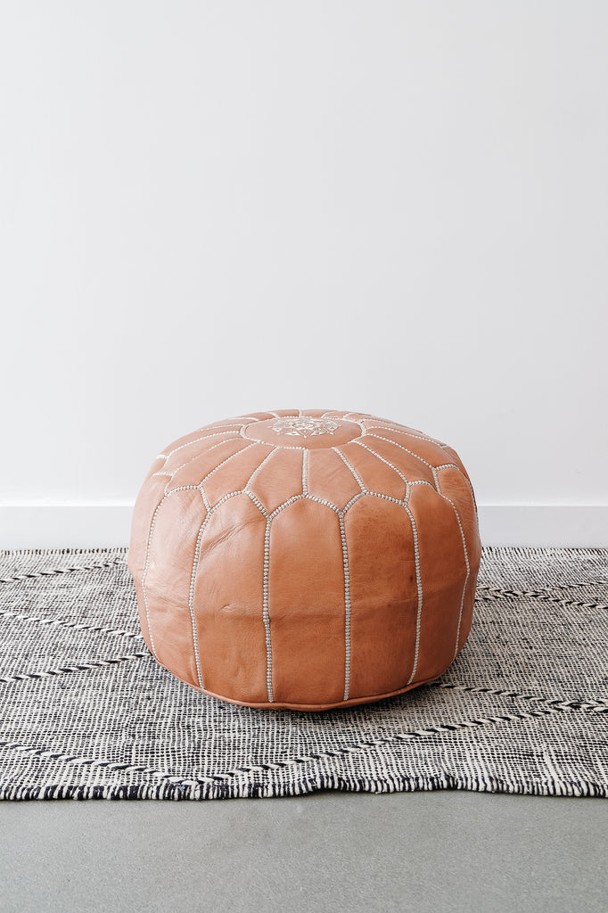 These leather poufs are expertly crafted and handstitched in Marrakech, Morocco. Made using semi vegetable-tanned leather with a softly worn waxed finish that deepens into a distinctive patina. There is natural variation between hides and stitching making each piece unique.